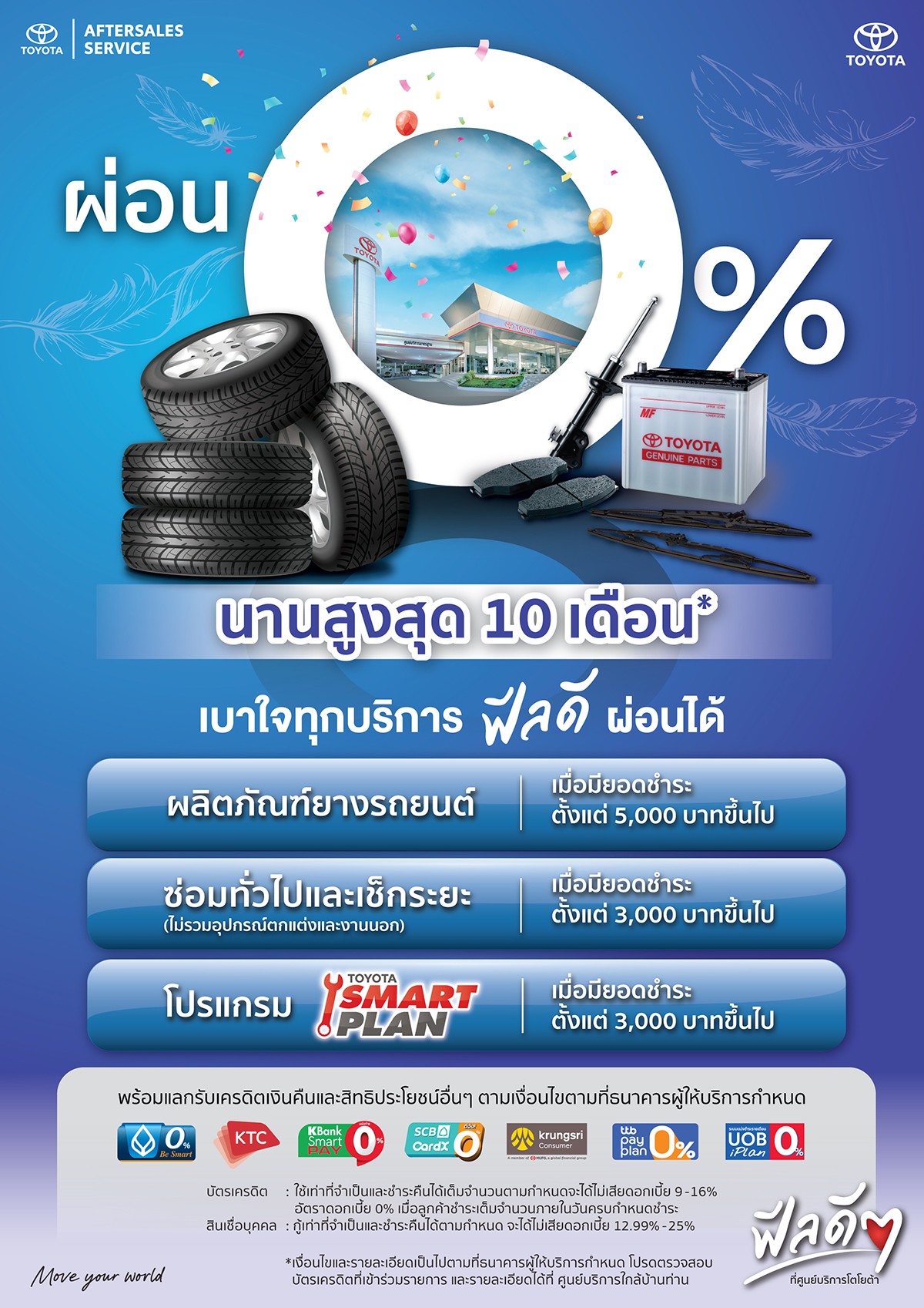 - ใช้เป็นส่วนลดเมื่อเข้ารับบริการเฉพาะงานเช็กระยะ ที่ศูนย์บริการโตโยต้าทั่วประเทศ